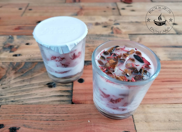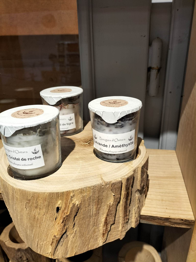 Composition : cire végétale BIO de soja, fragrance bois de santal, écorce séchée et hachée de bois de santal, « Œil de Tigre » purifié à l'eau puisée à même la source et chargée à la pleine lune.