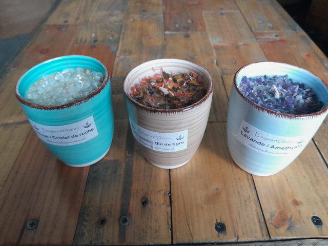 Pour offrir ou pour vous offrir nous vous proposons notre trio de bougies (lavande/améthyste, sauge/cristal de roche et Palo Santo /œil de tigre);